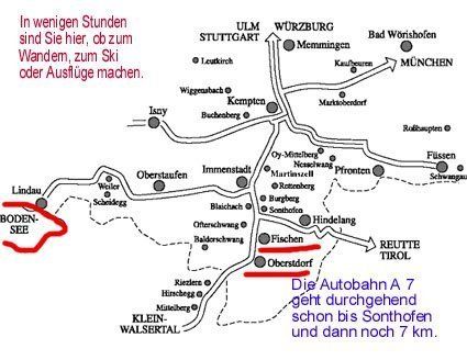 Mit dem Auto fahren Sie auf der A7 bis Kempten /Waltenhofen und dann immer auf der B19 Richtung Oberstdorf. An der ersten Ampel in Fischen biegen Sie rechts ab nach Fischen Berg in die Berger Steige, nach ca. 180 m geht es links in den Imbergweg . Den folgen Sie ca. 220 m und biegen rechts in die Kapfstraße ab. Dann haben Sie es auch gleich geschafft, unsere Ferienwohnung befindet sich in der Kapfstraße 11.